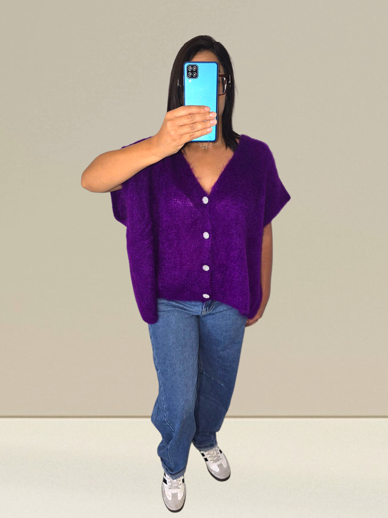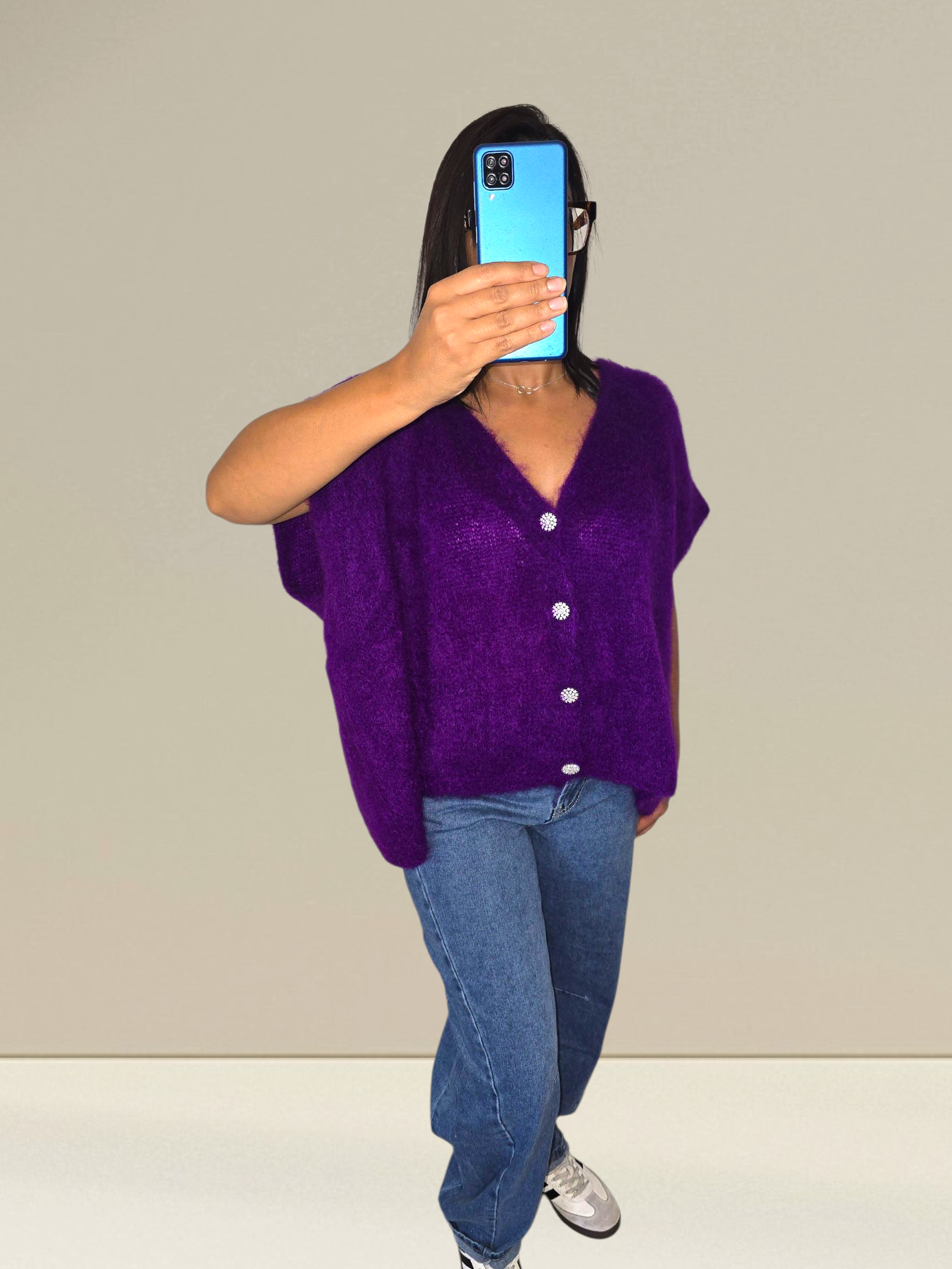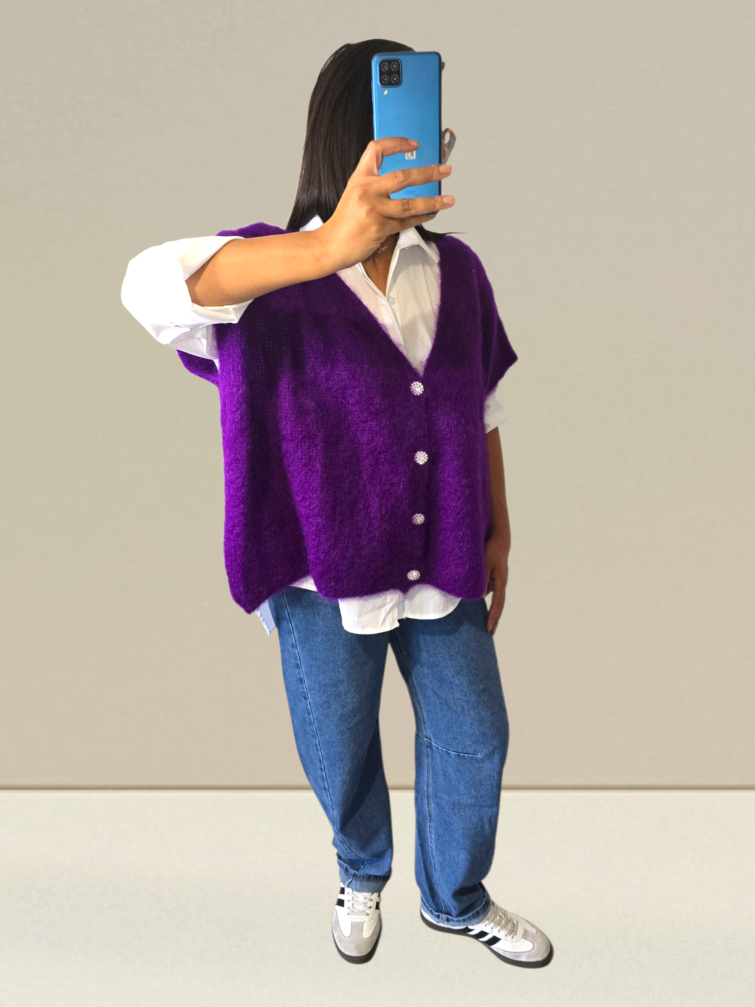 PULL SANS MANCHES EN KID MOHAIR - BOUTONS BIJOUX- FUSHIA
