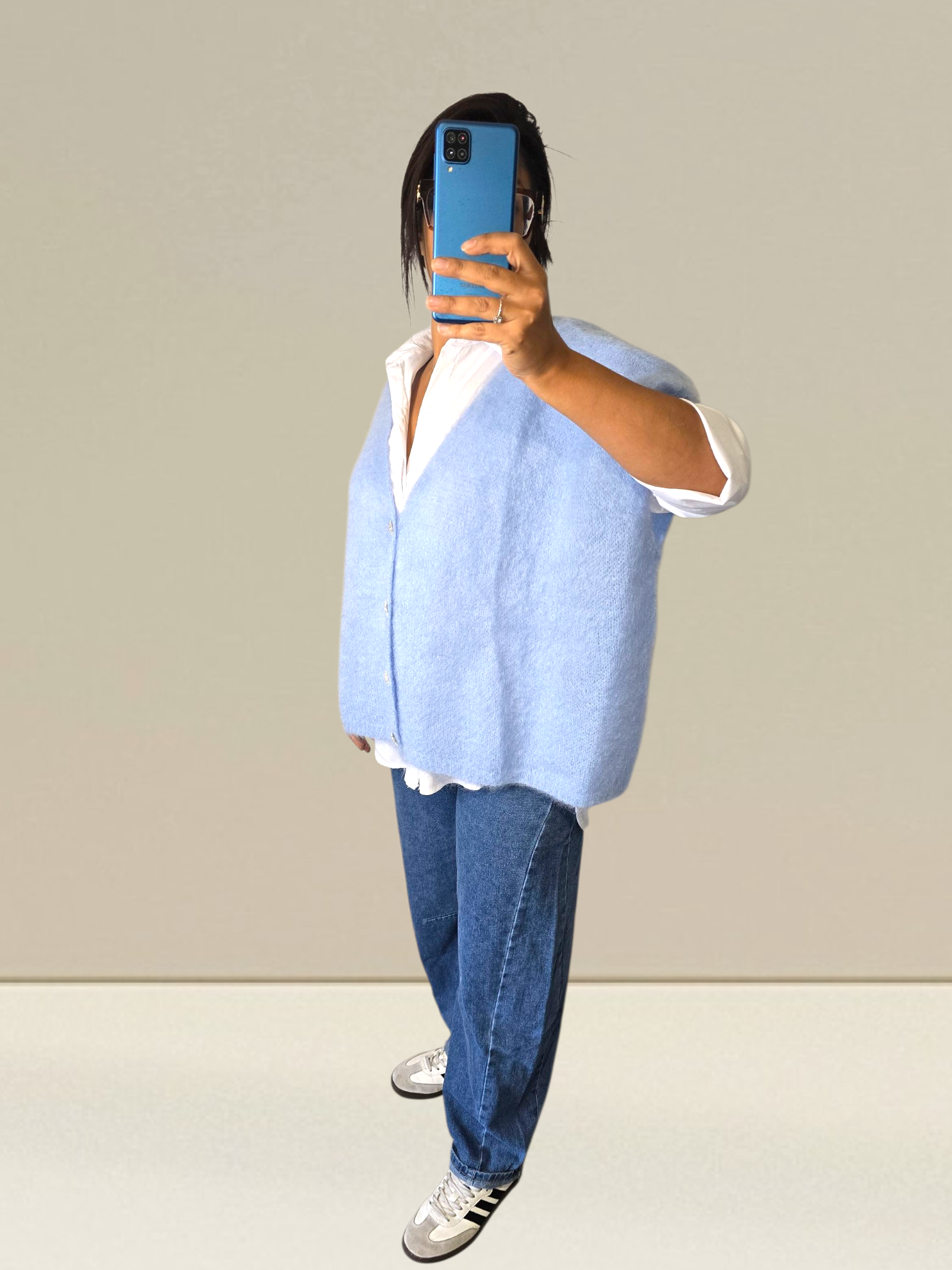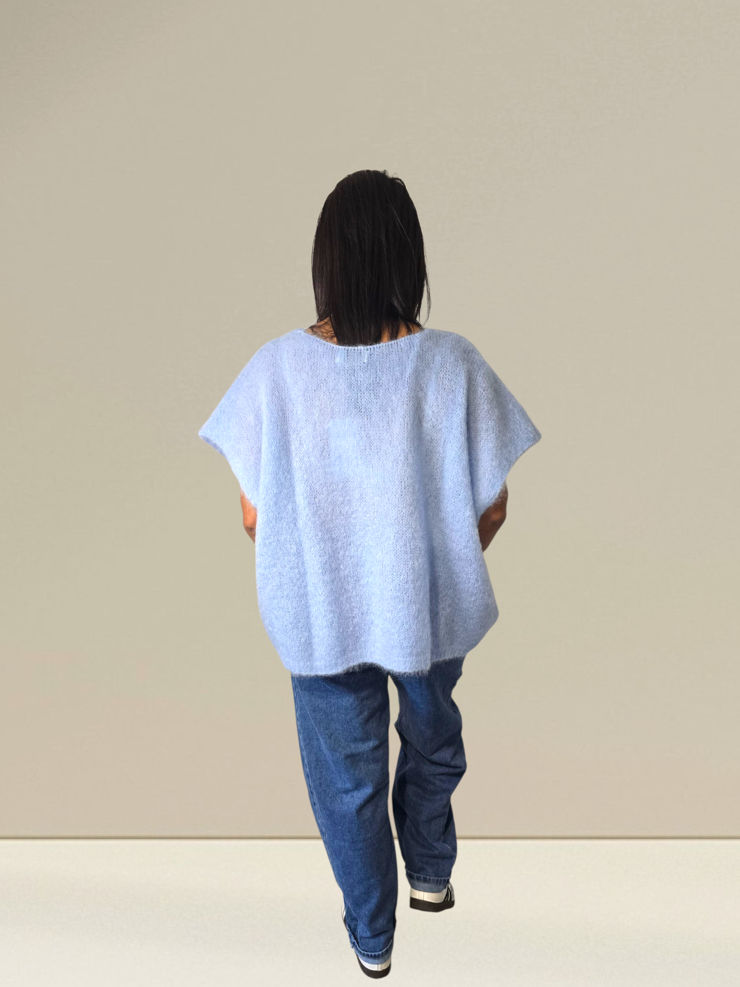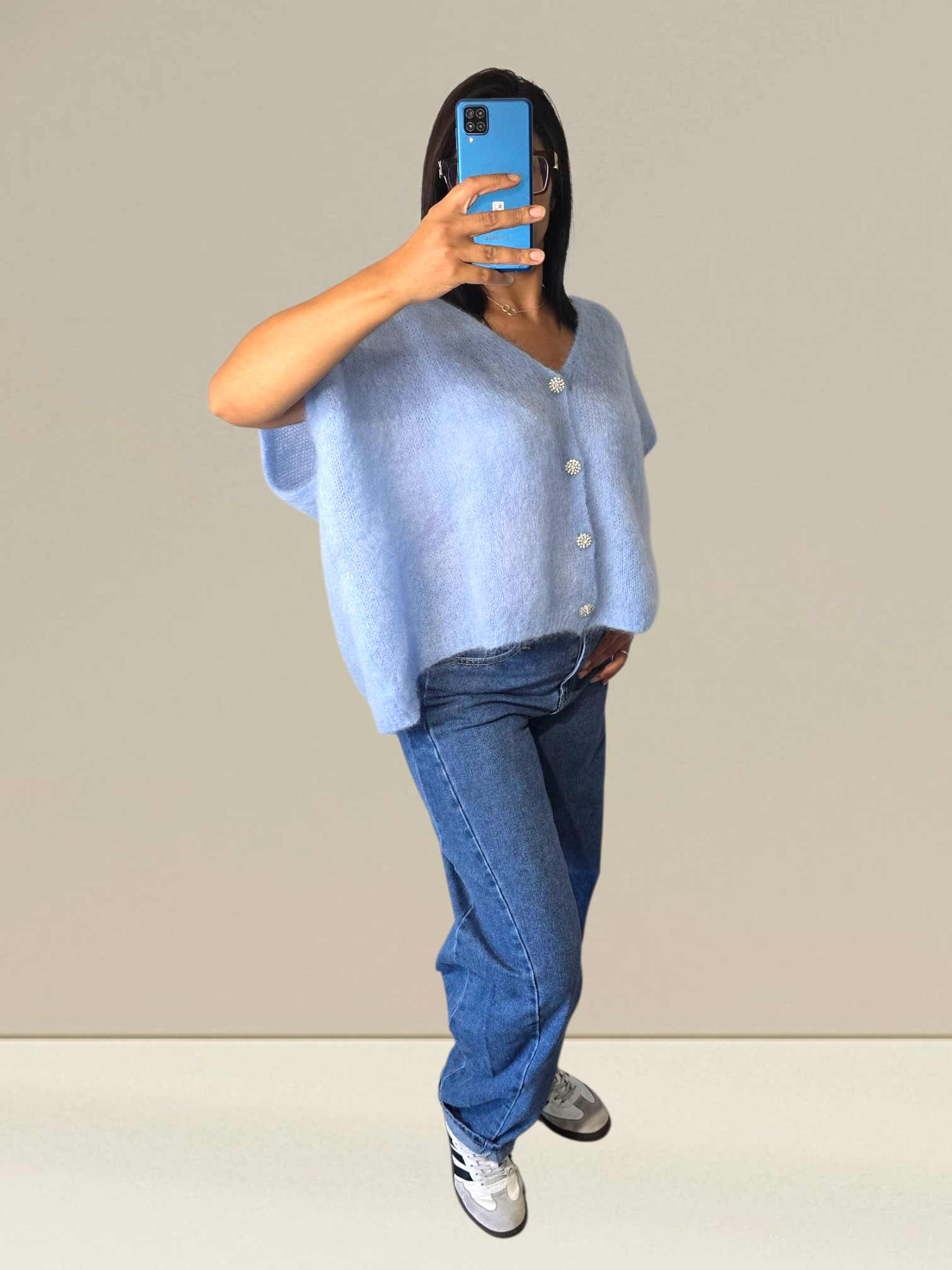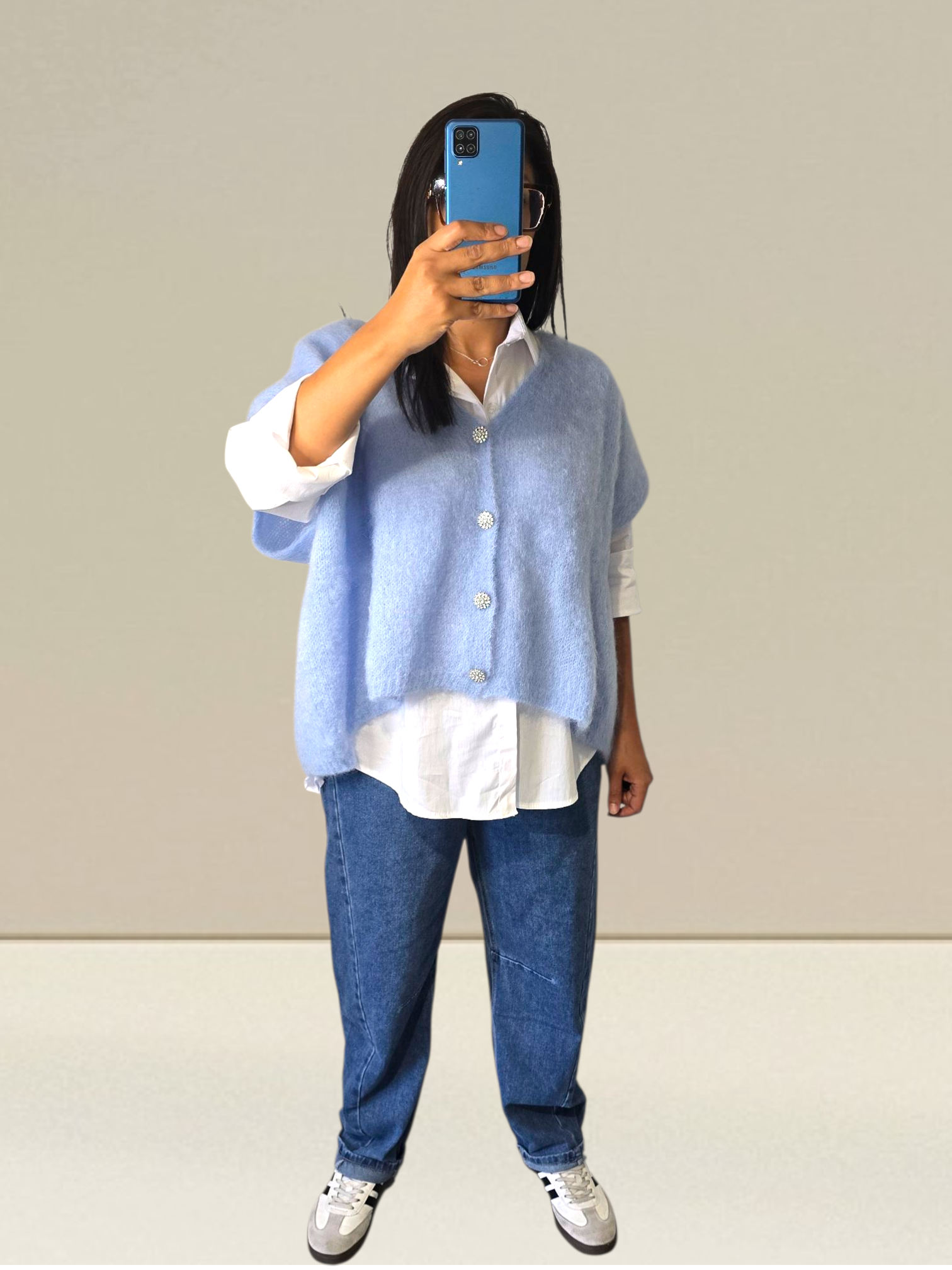 PULL SANS MANCHES EN KID MOHAIR - BOUTONS BIJOUX- BLEU CIEL