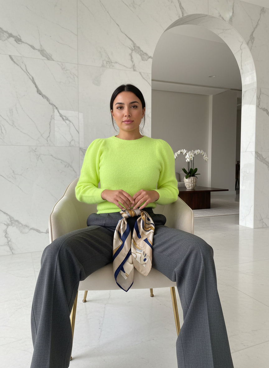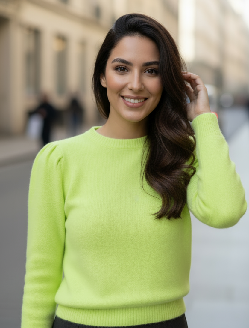 Pull sans couture en alpaga et laine vierge. Col rond manches longues. Fantaisie au niveau des épaules.