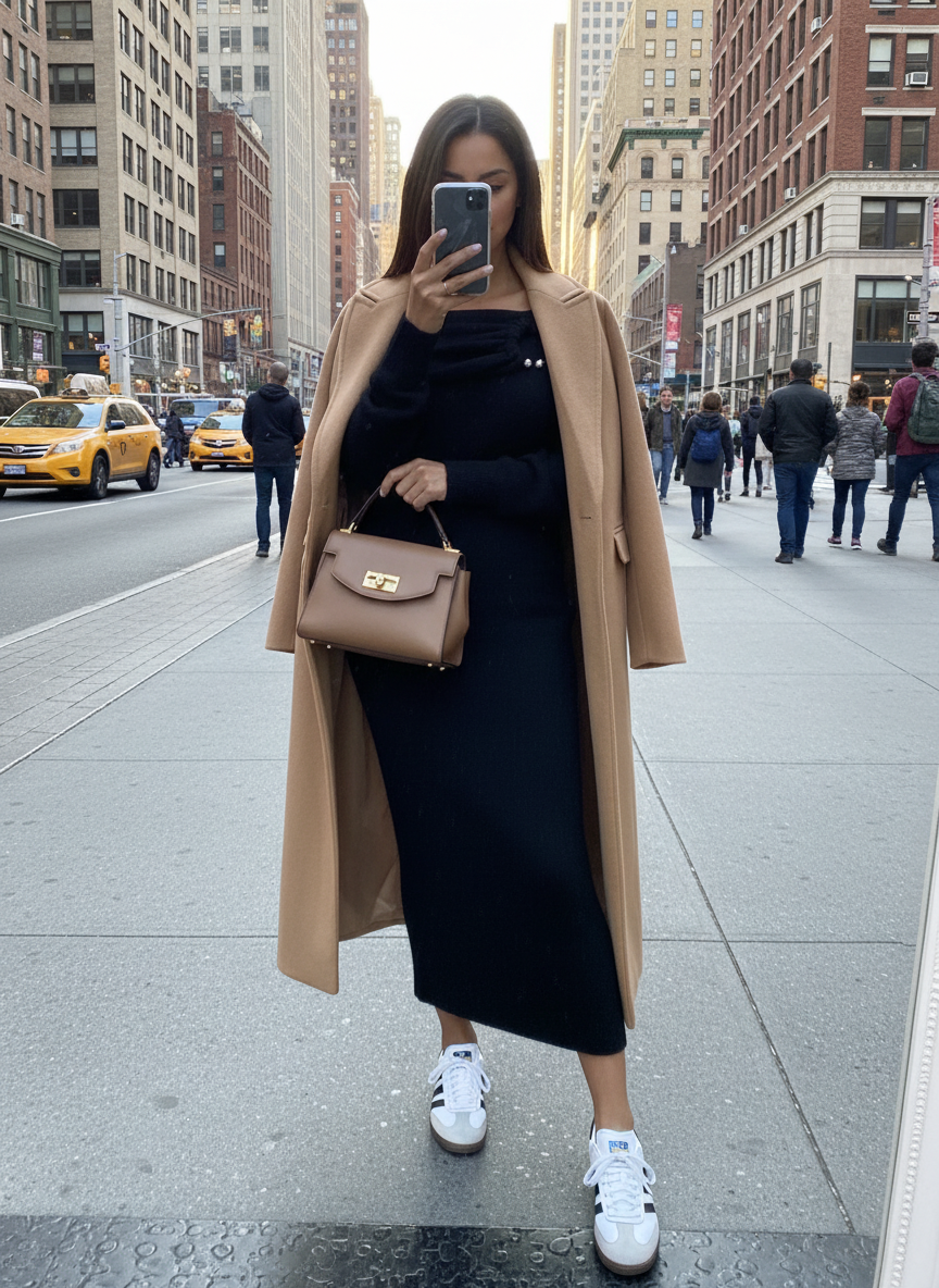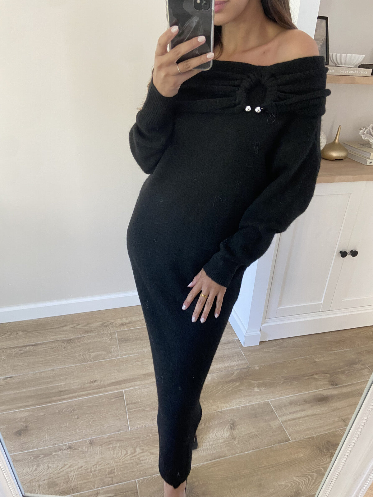 Robe pull chic allie élégance en matière recyclée vous offre à la fois confort et style. Son col bardot, maintenu par un détail, apporte une touche sophistiquée à ce modèle épais et chaleureux.